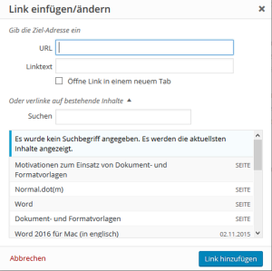 - Anschließend kann das Link-Fenster aufgerufen werden (vgl. oben)