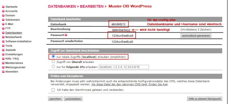 - Wichtig ist, dass der Username mit dem Datenbanknamen identisch ist. Der Username hat nichts mit irgendeinem in WordPress selbst vergebenen Usernamen zu tun!