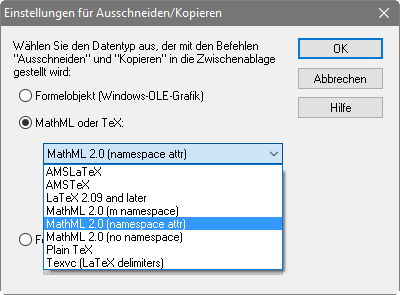 In der Standardeinstelllung können MathType-Formeln nicht im Word-eigenen Formel-Format kopiert oder abgespeichert werden; es ist lediglich möglich, eine MathType-Formel in den Baustein der Word-Formel einzufügen, sie bleibt dort aber ein MathType-Objekt. Das gilt, wie gesagt, für die Standardeinstellung. Aber auch hier (wie in der anderen Richtung von Word zu MathType) hilft MathML! In MathType kann bei den Einstellungen zum Ausschneiden/Kopieren zwischen drei MatML-Arten gewählt werden. Die für Word richtige ist MathML 2.0 (namespace attr):