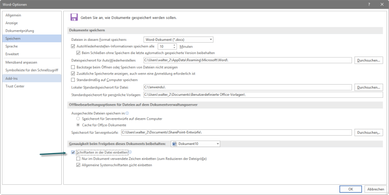 Für Dokumente und Dokumentvorlagen werden die Standardspeicherorte in den Word-Optionen unter „Speichern“ festgelegt: