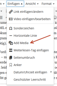 - Auf die Stelle klicken, an der das Objekt eingebaut werden soll, dann den Befehl „Add Media“ wählen: